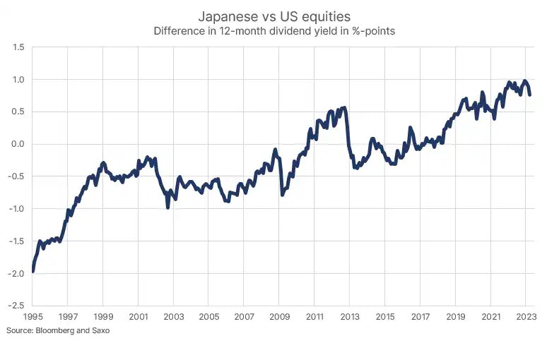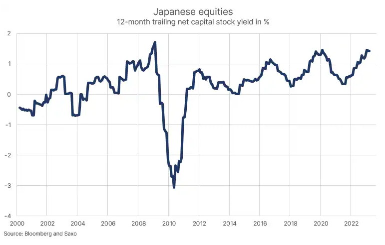 One of the most interesting aspects of the Japanese equity market is its valuation level. Japanese equities are valued on the 12-month forward EV/EBITDA at 6.7x which is a 48% discount to US equities reflecting extraordinary relative pessimism of Japanese companies. The more than a decade bull market in US technology stocks have created an expectations gap between the US and Japan like anything we have ever seen before. This is also evident in the difference in the dividend yield between Japan and the US which has increased from -2%-points to +0.8%-points since 1995. Another positive factor for Japanese equities is the capital productivity improvement by Japanese companies which has made it possible for these companies to increase the payout to shareholders through buybacks. In the past five years, the average buyback yield has averaged 0.9%.